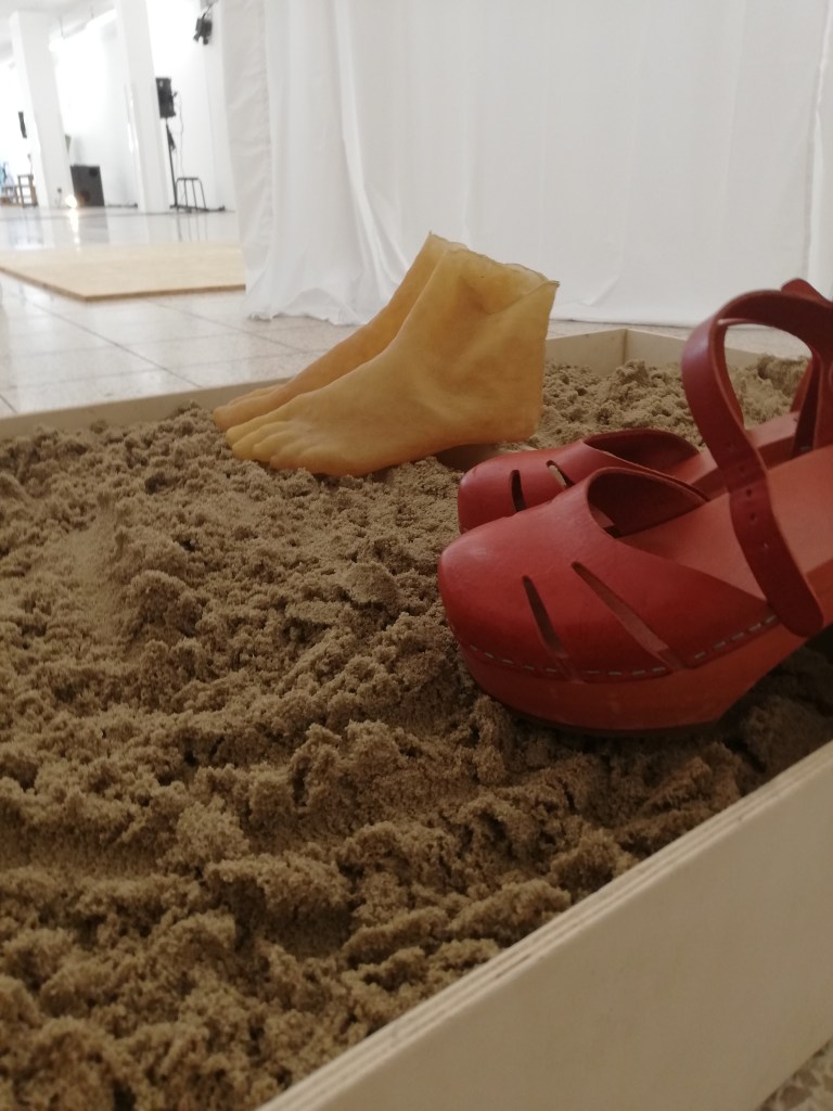 Teilchen is a one to one situation, in which every time a successful experiment is being performed. Seated on a square table the visitor and the artist negotiate in silence with the help of sentences written on cards and head nods. The visitor agrees to participate in an experiment dealing with memory particles. The expected result is memories that are important for the artist to start living an independent life in the visitor’s mind. To guarantee the success of the experiment, the artist and the visitor need to plant their bare feet in a personal box of sand, each placed under the table.